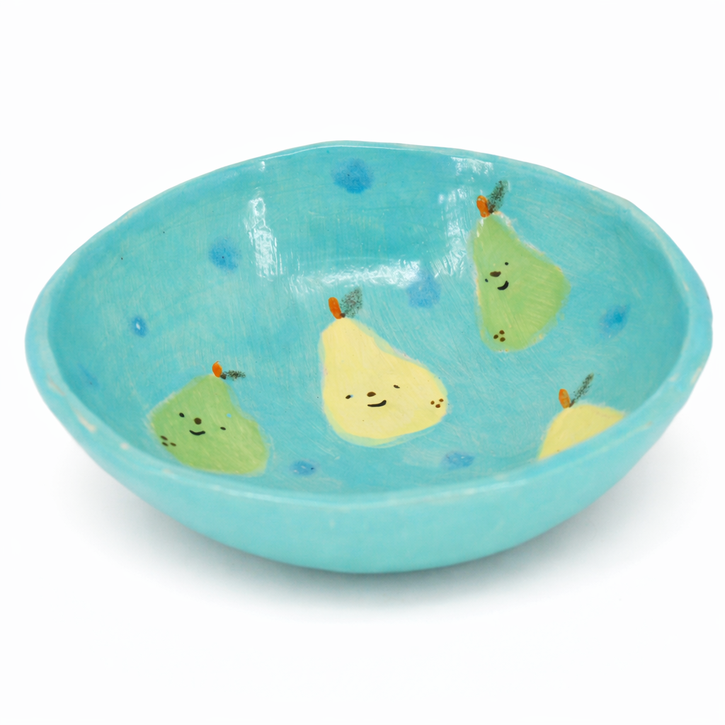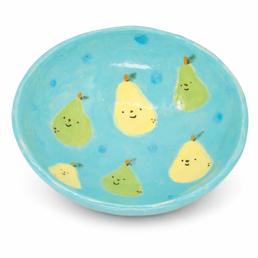 Este bowl de cerámica artesanal presenta un delicado interior celeste pintado a mano, decorado con peras ilustradas con pequeñas expresiones que transmiten alegría y cercanía. Su paleta suave y fresca lo convierte en una pieza luminosa, ideal para aportar color y calidez a cualquier espacio.