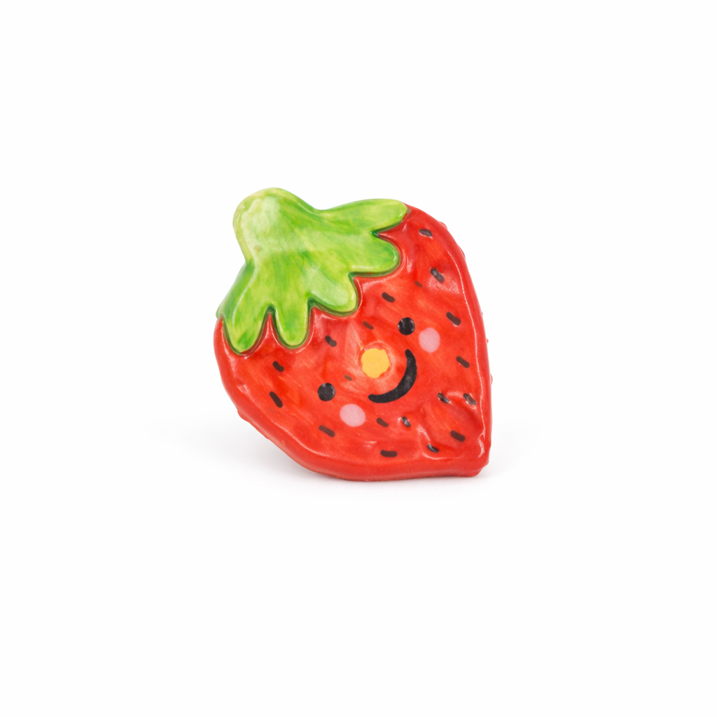 Este imán de refrigerador con forma de frutilla está hecho en cerámica artesanal y pintado a mano, destacando por su expresión simpática y colores vivos. Es una pieza pequeña pero llena de carácter, ideal para darle un toque alegre y cercano a tu refrigerador o cualquier superficie metálica.